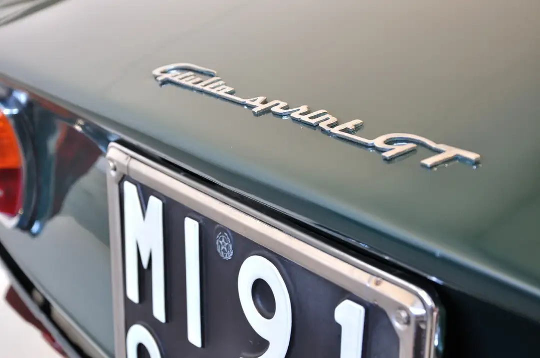 Alfa Romeo Giulia Sprint Gt 105.02, prime targhe (MI) e libretto a pagine, omologazione ASI targa ORO, spettacolare abbinamento cromatico Verde Muschio con interni misto tessuto e vinile marroni, motore AR00502 da 1600cc e 103cv di potenza, carburatori Weber 40 DCOE 4, cerchi da 15 pollici con pneumatici da 155. Uno dei primi esemplari prodotti in serie, immatricolato a gennaio 1964, con paraurti in unico pezzo cromati, mascherina a 6 listelli, apertura bagagliaio lato destro, fermacofano anteriore a compasso, posteriore con molle a torsione.