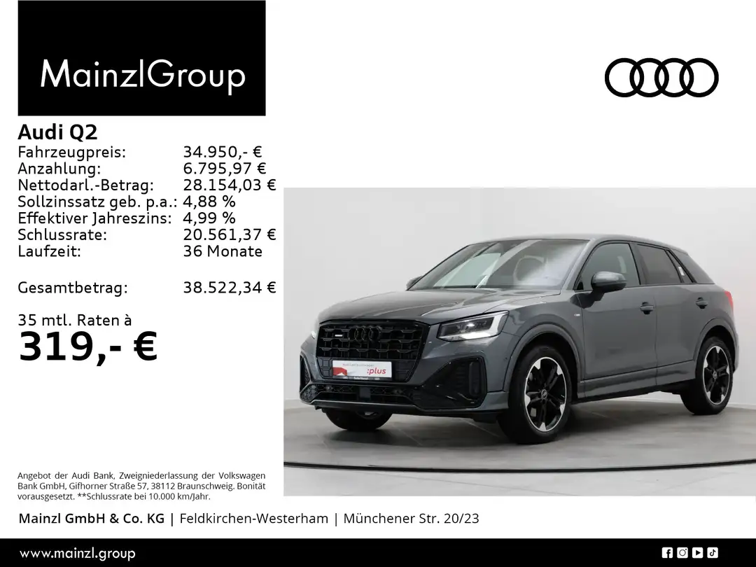 Top-Infotainment High (MIB3), Halteassistent, Smartphone-Interface, Fußgänger- und Radfahrerschutzmaßnahmen erweitert und vorausschauend, Reserverad platzsparend, Erhöh.der Serienkraftstofferstbefüllung, Beifahrersitz höheneinstellbar, Gepäckraumklappe elektrisch öffnend und schließend, Kindersicherung elektrisch betätigt, Wegfahrsperre elektronisch, Heckscheiben-Wisch-Waschanlage mit Intervallschaltung, Betriebserlaubnis Nachtrag, Audi connect Remote & Control (für MMI Navigation plus), LTE-Unterstützung für Audi phone box, Audi connect Navigation & Infotainment, Rückfahrkamera, Stoff Puls/Leder-Kombination, Kindersicherheits-Paket, Interieur S line mit Sportsitzen in Stoff/Leder-Kombination schwarz/grau, Komfortpaket Sitze, Komfortpaket plus, Funktionspaket Reifen, Assistenzpaket Parken, Assistenzpaket Fahren, Assistenzpaket Sicherheit, Funktionspaket, Ablage- und Gepäckraumpaket mit USB-Ladeschnittstellen im Fond, Interieurapplikationen Aluminiumoptik, Ambiente-Lichtpaket plus, Kamerabasierte Verkehrszeichenerkennung, Sportsitze vorn, Steuerung von Aktionspreisen, Pedalerie und Fußstütze aus Edelstahl, Sonnenschutzverglasung abgedunkelt, Klima- und Komfortpaket, Steuerungsnummer 8, Steuerungsnummer Assistenzpaket Fahren, Anhängevorrichtung, Bordwerkzeug und Wagenheber, Entfall Modellbezeichnung und Leistungs-/Technologie-Schriftzug, Kindersitzbefestigung ISOFIX für den Beifahrersitz, Rücksitzlehne, geteilt umklappbar, Sitzheizung vorn, Innenspiegel automatisch abblendend, rahmenlos, Airbags vorn, Beifahrerairbag deaktivierbar, Optikpaket schwarz plus, Räder Audi Sport, 5-Doppelspeichen-Trapezoid, schwarz, glanzgedreht, 7,0Jx18, Reifen 215/50 R18, Komfortmittelarmlehne vorn, Embleme, Sideblades in Wagenfarbe, Adaptiver Fahrassistent mit Notfallassistent, Audi pre sense front für adaptiven Geschwindigkeitsassistenten, Dachhimmel in Stoff schwarz, Außenspiegel elektrisch einstell-, beheiz- und anklappbar, beidseitig automatisch abblendend, 4-Wege-Lendenwirbelstütze für die Vordersitze, Dekoreinlagen Lichtgrafik Format, MMI Navigation plus mit MMI touch, Audi pre sense basic, Parkassistent mit Einparkhilfe plus, Spurwechselwarnung, Fernlichtassistent, Adaptiver Geschwindigkeitsassistent, Komfortklimaautomatik, Zigarettenanzünder und Aschenbecher, Audi Soundsystem, Audi phone box, Landesverkaufsprogramm Deutschland, Serienqualität, Rechtsverkehr, Audi AG, Q2 S line, Typprüfland Deutschland, 4-Zyl.Turbodieselmotor 2,0 L/110 KW(4V) TDI CR , GM:T37/T3Y/TS1/T4P/T98/T4S/TR1 T0P/T0N/T13/T29/TD1/TI9/T3C/T1N/T27/T1Q, Ablenkungs- und Müdigkeitserkennung, Regionscode " ECE " für Radio, Abwicklung Serie, Individualeinbau der Audi Sport GmbH, Variante Grundausstattung, Räder der Audi Sport / Quattro GmbH, Fahrzeuge mit besonderen Produktaufwer- tungsmaßnahmen, S tronic, Dämpfung vorn, Dieselmotor, Batterie 420A (70Ah), Kältemittel R1234yf, Geschlossener Aufbau, Linkslenker, Steuerung SWIN, Transportschutz (Ausf.1), Batterie/Generator Kapazität Standard, Audi connect Notruf & Service, Wartungsintervallverlängerung, Serviceanzeige 30000 km oder 2 Jahre ( variabel ), Mit Multifunktionskamera, Digitaler Radioempfang, Reifen 215/50 R 18 92W, 4 Zyl.Dieselmotor 2,0L Aggr. 05L.C, Entriegelung Hintersitz Standard, Instrumenteneinsatz, Anzeige in KM/H, Einstiegsleisten mit Aluminiumeinlegern vorn, beleuchtet, S-Schriftzug, Stabilisator vorn, 5 Türen, Stabilisator hinten, Radstand, Standard, Fertigungsablauf Standard, Kraftstoffsystem Diesel, Einbau Differenzierung für Getriebe"DQ381" -- Fahrzeugteile --, Mit spez.Schilder/Aufkleber/ Sicherheitszertifikate für Deutschland, Fahrzeugklassen-Differenzierung -GA0-, Vier-Lenkerachse, Abgasendrohre, Fußmatten vorn und hinten, Bordliteratur in Deutsch, Standard-Klimazonen, Elektronische Stabilisierungskontrolle (ESC), spezielles Typschild EU, Sportfahrwerk, Progressivlenkung, Radschrauben Standard, Verbandmaterial mit Warndreieck, Lederlenkrad 3-Speichen mit Multifunktion plus, quattro, Scheibenbremsen vorn, 16 Zoll, Scheibenbremsen hinten, 15 Zoll, Stoßfänger S line in Volllackierung (Wagenfarbe), Aufkleber/Schilder, englisch-deutsch, ISOFIX und Top Tether für Fondsitze außen, Dachreling, Entfall, Kopfstützen hinten (3 Stück), Frontscheibe mit grauem Colorstreifen, Modul Boden hinten Ausführung 7, Fensterheber, Abgaskonzept, WLTP3 M1, N1-I//EU6EA, Seitenairbags vorn und Kopfairbagsystem, Trägerfrequenz 433,92 bis 434,42 MHz, Dachspoiler, Folienbeklebung, Außenspiegel rechts (großes Sichtfeld), konvex, Außenspiegel links, asphärisch, Kopfstützen vorn, Außenspiegelgehäuse in Wagenfarbe, Kofferraumbodenmatte, Heckblende (ECE), Kennzeichenträger vorn, Elektrische Luftzusatzheizung, Schalt-/Wählhebelknauf, Reifendruck-Kontrollanzeige, Start-Stop-System mit Rekuperation, LED-Scheinwerfer, Drehstromgenerator 140 A, Tagfahrlicht, Nebelschlussleuchten, Heckleuchten, Waschwasser-Standanzeige, Doppelton-Signalhorn, Gurtanlegekontrolle, Audi virtual cockpit, Bremsbelagverschleißkontrolle, Garantie 24 Monate ab Tag der Erstzulassung