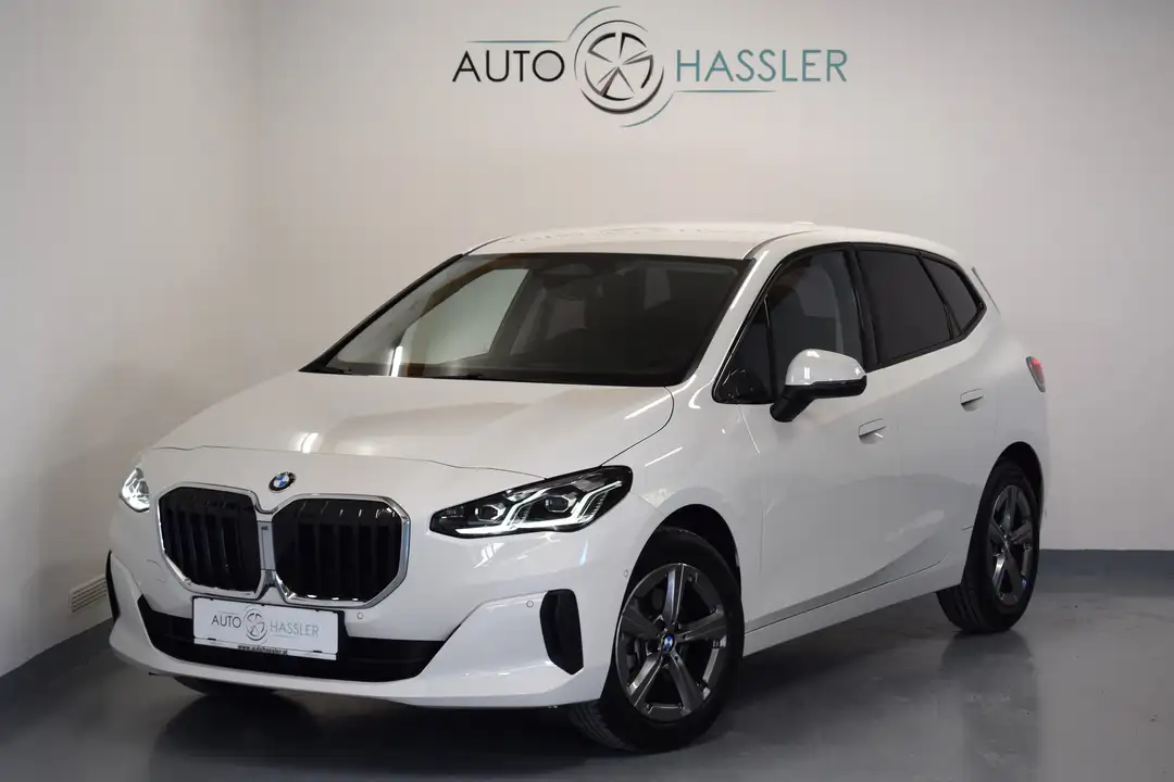 - Zum Verkauf angeboten wird ein BMW 216i Active Tourer in der Farbe Alpinweiß.