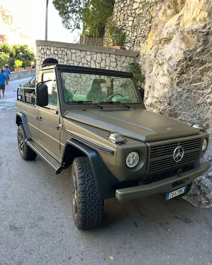 Here for sell the most beautiful G230 convertible ( I’ve named it “ARMY “ and it’s based on a 1994 PUCH g230 and has custom badges ) available on the market ! It’s been restored to keep the original military style but highly modified (engine restored to original specs ). The everything it’s been redone and modified and now car looks like new ! I’m an Italian interior designer and I’ve created this one to represent my style and personalized everything to my liking :). Car is been lifted with special bilstein suspension and the ride is just perfect. Comfortable and smooth but yet sporty (I own a g63 and this one is smoother ) comes with a set of 20’s amg wheels professionally resprayed in a matching gloss army green color. Just perfect ! Bf goodridge all terrain brand new big tires follows. All interior is been customized by the best artisan in my region starting with a custom color leatherette ( Mint green ) and using new rear benches and 2 front custom recaro seats with rear matching army green color !! I will add more interior picts soon. Bluetooth big monitor mounted on center dash ! Hand made carpet fitted all over from front seats to rear benches in a perfect matching color. I mean this is a work of art and if you can afford it this is your summer car for sure. It’s a jaw dropping G and will attract so much attention that is insane to drive. This car was built for an open use only ! I do have original soft top but I’ve got rid of few metal elements in order to give this car the most sleek look possible … car is available in Positano (amalfi coast ) very well known vehicle here :) If you live in a summer place and your looking for the hottest vehicle that can accommodate 2 in the front and 6 in the back THIS IS IT !! No dreamers and no offers. I will sell it at the first serious buyer at 150000 euros firm ! Have a great day Franco