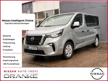 Außenausstattung, Außenspiegel: Außenspiegel elektrisch anklappbar, Außenspiegel: Außenspiegel elektrisch einstellbar, beheizbar, Beleuchtung: Fahrlichtautomatik, Beleuchtung: Nebelscheinwerfer, Beleuchtung: Voll-LED-Scheinwerfer, Bereifung und Räder: Radvollabdeckung, Karosserie: Hecktüren mit 180° Öffnungswinkel verglast inkl. Heckscheibenheizung und -wischer, Karosserie: Schiebetür links mit Schiebefenster, Karosserie: Schiebetür rechts mit Schiebefenster, Scheiben: Schiebefenster in der 2. Reihe, Innenausstattung, Interieur: LED Innenbeleuchtung, Klimatisierung: Klimaanlage vorn und hinten inkl. Schnellheizer, Kofferraum: Gepäckraumabdeckung, Sitze: Armlehnen auf allen Sitzplätzen, Sitze: Fahrersitz, höhenverstellbar, mit Armlehne, Sitze: Lordosestütze für Fahrersitz, Sitze: Sitzbank 2. Reihe mit 3 Sitzplätzen, Sitze: Sitzbank 3. Reihe mit 3 Sitzplätzen, Sicherheit und Technik, Assistenz-Systeme: Autonomer Notbrems-Assistent, Assistenz-Systeme: Fernlicht-Assistent, Assistenz-Systeme: Intelligenter 360-Grad-Flankenschutz, Assistenz-Systeme: Intelligenter autonomer Notbremsassistent mit Kollisionswarnsystem, Assistenz-Systeme: Rückfahrkamera in Farbe, Assistenz-Systeme: Totwinkel-Assistent, Assistenz-Systeme: Verkehrszeichenerkennung, Fahrerassistenz-Paket PRO: Intelligenter Spurhalte-Assistent, Fahrerassistenz-Paket: Licht- und Regensensor, Fahrerinformationsystem: Tempopilot mit Geschwindigkeitsbegrenzer, Infotainment & Navigation: DAB Radio inkl. Bluetooth® Freisprecheinrichtung, Lenkradfernbedienung, USB- Anschluss, Infotainment & Navigation: Fahrerinformationssystem mit 7"-TFT-Farbdisplay, Infotainment & Navigation: Induktives Smartphone-Ladegerät, Infotainment & Navigation: NissanConnect Navigation, Infotainment & Navigation: Warnung bei Überschreitung der Geschwindigkeitsgrenze, Interieur: Elektrische Fensterheber vorn mit Impulsfunktion Fahrerseite, Interieur: Sitzheizung Fahrer- und Beifahrersitz, Komfortfunktion: Zusatzheizung für den Fahrgastraum, Sicherheit: Fahrer- und Beifahrerairbag, Sicherheit: Intelligente Müdigkeitserkennung, Sicherheit: Notruf und Pannenanruf (eCall), Sicherheit: Seiten- und Windowairbags vorn, Sicherheit: Zentralverriegelung mit Funkfernbedienung
