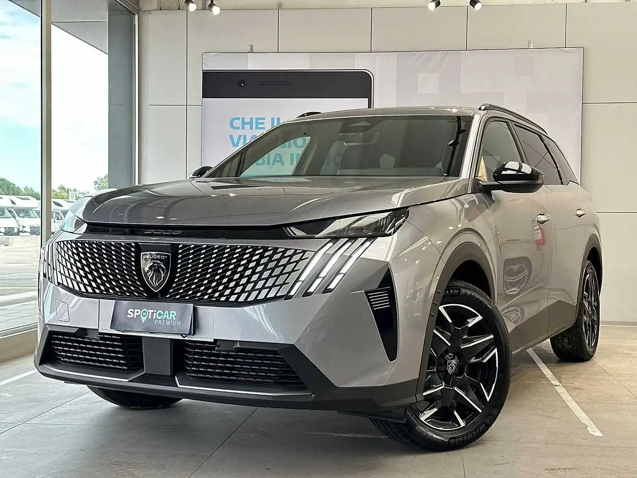 - Fascia nera lucida tra i proiettori anteriori con logo 5008