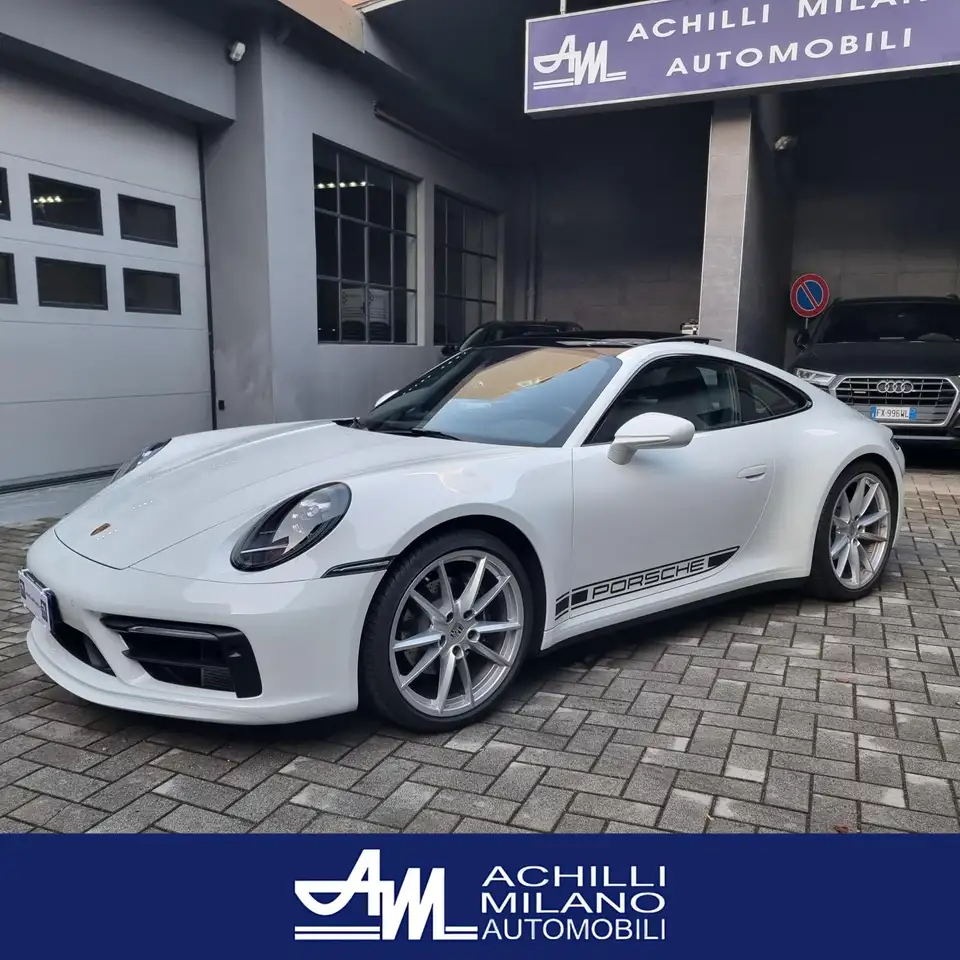 Sintesi del mondo 911, per questa coupè 992 bianca, con cerchi, vetri e rifiniture nero lucido, tetto in vetro nero ed il pacchetto SPORT DESIGN COMPLETO DI SCARICO SPORTIVO , ESSENZA DELLA 911 che deve essere coupè 2 ruote motrici , con uno spirito sportivo evidenziato da SPORT DESIGN CHE RENDE SPORTIVA ED ANCHE MODERNA questa 992 con lo scarico sportivo, BOSE SOUND