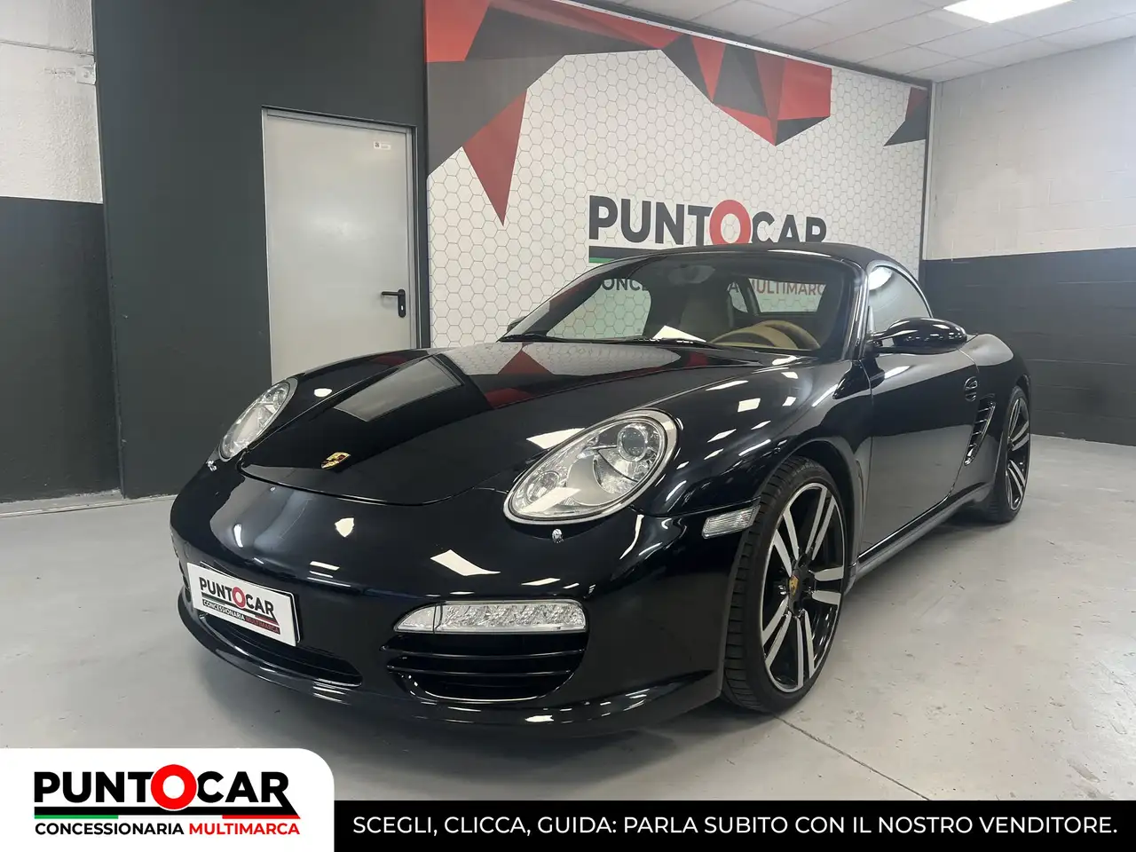 Airbag guida, Airbag passeggero - Alzacristalli elettrici con funzione tip-up e tip-down - Antifurto ruote - Appoggiatesta integrati - Apriporta con telaio - Cambio manuale a 5 marce con volano a doppia massa - Capote con lunotto in vetro riscldabile - Cerchi in lega da 17 6½J(8J) con pneum. 205(235)/55(50) ZR 17 - Chiave con inibitore d'avviamento (sistema transponder) - Chiave della vettura con telecomando integrato e sbloc. vano bag. - Chiusura centralizzata con telecomando - Chiusura elettr. della Capote con abbassam. comfort (fino 50Km/h) - Climatizzatore automatico - Computer di bordo - Contagiri - Cristalli laterali anteriori con rivestimento idrorepellente - Disp. di disinser. airbag in caso di montaggio seggiol. per bamb. - Display multifunzione - Fari fendinebbia - Filtro a carbone attivo - Fondoscala strumenti color nero - Funzione Coming Home - Griglia presa d'aria nera nel paraurti anteriore - Illum. unificata dell'abitac. con variaz. continua di luce bianca - Illuminazione d'orientamento interna - Illuminazione vano piedi - Immobilizzatore elettronico - Interni verniciati in Alu-look - Kit di riparazione pneumatici con compressore elettrico - Leva cambio e freno a mano rivestiti in pelle - Logo Boxster nei listelli sottoporta - Pedaliera in look sportivo - Pinze freni nere anodizzate - Porsche Side Impact Protection System (POSIP) - Porsche Stability Management (PSM) con ABS, ASR, ABD e MSR - Portaoggetti nel tunnel centrale - Portaoggetti nelle portiere - Predisp. per fissaggio seggiolino per bambini ISOFIX - Predisposizione per cambia CD - Prese d'aria laterali in color titanio - Pretensionatore cinture anteriori - Radio Porsche CDR 24 (2x25 Watt) con 4 altoparlanti - Rete fermabagagli - Retrovisore lato guida asferico - Ricircolo aria - Rivestimento interno della capote - Sbloccaggio elettrico del cofano ant. e post. - Scomparto portaoggetti da 6,5l con chiusura a chiave - Scomparto portaoggetti nella consolle centrale - Scritta color titanio sul cofano posteriore - Sedili ant. con reg. elettr. dello schienale - Sedili anteriori reg. manualmente in altezza - Sedili in fintapelle e Alcantara - Sedili regolabili manualmente in pos. longitudinale - Servosterzo a rapporto variabile - Specch. di cortesia illum. ed integrato nelle alette parasole - Specchietti retrovisori reg. e riscaldabili elettricamente - Spoiler posteriore ad uscita automatica - Tergicristallo a due velocità - Terminale di scarico centrale - Terza luce stop con LED - Vetri termoisolanti verdi - Volante a 3 razze - Volante reg. in altezza - Volante reg. in profondità