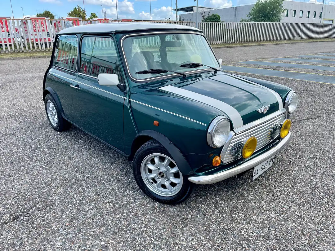 Vendo splendida Rover Mini Cooper 1.3i del 1994 con targhe originali, colore British Racing Green con tetto bianco e strisce sportive originali.