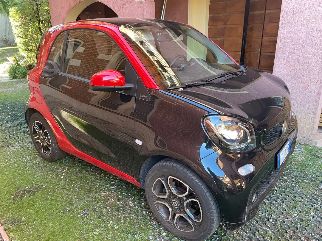 Vendo Smart fortwo turbo bicolore rossa e nera anno 2017, 900 cc, 90 cv, mai incidentata, unico proprietario, perfetta sia carrozzeria che interni, volante sportivo multifunzione, grande tettuccio panoramico, aria condizionata, cambio automatico, possibilità di selezione guida sportiva, stop and go. Solo km 34.000. Praticamente nuova.
