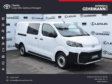 2.Sitzreihe mit Sitzbank, 2.Sitzreihe mit Sitzbank geteilt/klappbar, Airbag Fahrer-/Beifahrerseite, Antriebs-Schlupfregelung (ASR / TRC), Anzeigeinstrumente digital, Audio-/Radio-Fernbedienung am Lenkrad, Außenspiegel heizbar, Beifahrerdoppelsitz, Bordcomputer, DAB-Tuner (Radioempfang digital), Einparkhilfe hinten, Fahrassistenz-System: Berganfahrkontrolle (HAC), Fahrassistenz-System: Fernlichtassistent (Abblendautomatik Fahrlicht, AHB), Fahrassistenz-System: Müdigkeitserkennungs-Sensor, Fahrassistenz-System: Pre-Collision-System (PCS), Fahrassistenz-System: Spurhalteassistent (LDA), Fahrassistenz-System: Verkehrszeichenerkennung (RSA), Fensterheber vorn elektr. mit Einklemmschutz, Fußmatten Gummi, Gepäck-/Laderaumleuchte, Harnstofftank (AdBlue), Heckflügeltüren mit Verglasung, Innenspiegel abblendbar, Karosserie/Aufbau: Kasten, Doppelkabine, Kindersicherung, Ladekantenschutz, Lenksäule (Lenkrad) verstellbar, Mittelarmlehne vorn, Modellpflege, Motor 2,0 Ltr. - 106 kW D-4D KAT, Navigationssystem: Multimedia Toyota Touch Pro, Nebelscheinwerfer LED, Nutzlast erhöht, Radstand 3275 mm, Reifendruck-Kontrollsystem, Reserverad in Fahrbereifung, Rückfahrkamera, Schadstoffarm nach Abgasnorm Euro 6d, Schadstoffarm nach Abgasnorm Euro 6e, Schiebetür rechts mit Verglasung, Seitenairbag vorn, Sitzausstattung: 6-Sitzer, Smartphone-Integration x-connect (Apple CarPlay und Android Auto), Staufach unter Beifahrersitzbank, Stop-Start-Anlage (Generator), Verglasung getönt