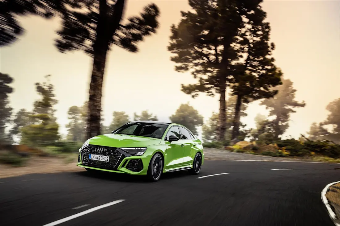 Al posto della classica frizione singola Haldex troviamo un pacco frizioni con una frizione singola per ogni ruota: in questo modo, è possibile scaricare una percentuale variabile della coppia ad ogni ruota, permettendo così di offrire una migliore motricità. La presenza di un differenziale posteriore così configurabile ha poi permesso ad Audi di introdurre per la prima volta una Drift Mode, che attraverso la ripartizione della coppia ad una sola ruota posteriore può enfatizzare il sovrasterzo, rendendo molto più viva ed eccitante la guida. Nonostante questa ritrovata euforia, comunque, la tipica stabilità granitica delle Audi RS non viene meno, così come le prestazioni. Nonostante un aumento di peso a 1.575 kg, l’Audi RS3 Sedan scatta da 0 a 100 km/h in soli 3,8 secondi, per una velocità massima autolimitata di 250 km/h. La RS3 8Y, infine, è anche equipaggiabile con un impianto frenante carboceramico, come le sorelle maggiori RS4 ed RS6.