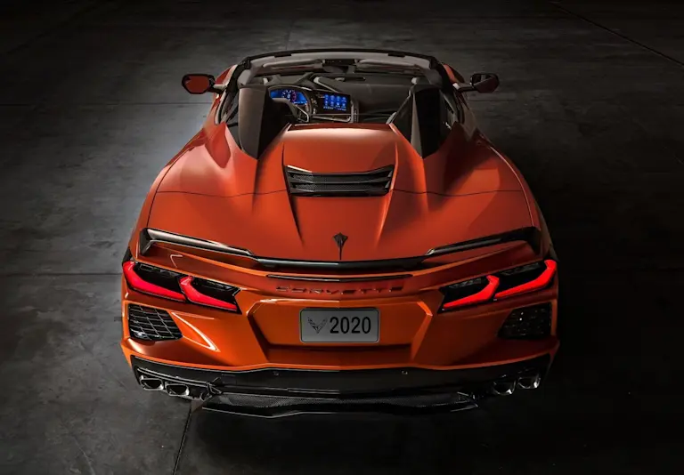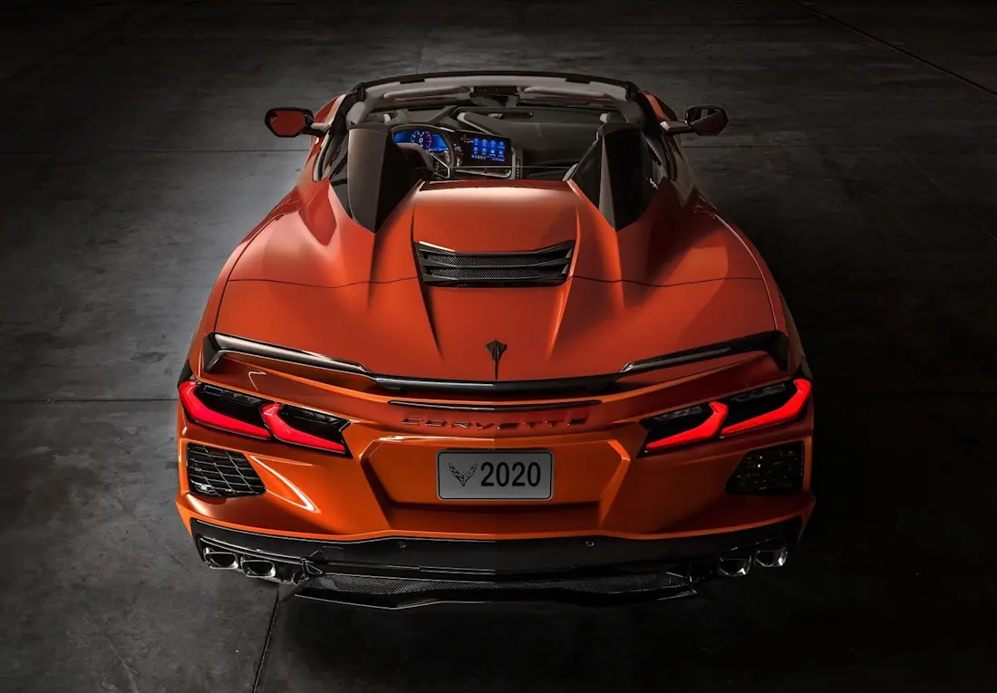 Sul posteriore della Corvette si ritrovano i dettami stilistici delle normali Chevrolet, come i fanali posteriori a LED a forma di freccia e le feritoie per tagliare l’aria. Infine, il nuovo scarico a quattro uscite laterali ha consentito di ridisegnare la scatola dei silenziatori, con una conseguente riduzione degli ingombri e uno snellimento complessivo del volume del paraurti, è stato ridisegnato sulla base della line tagliente che riprende il muso ed affina ulteriormente le linee della Corvette C8.